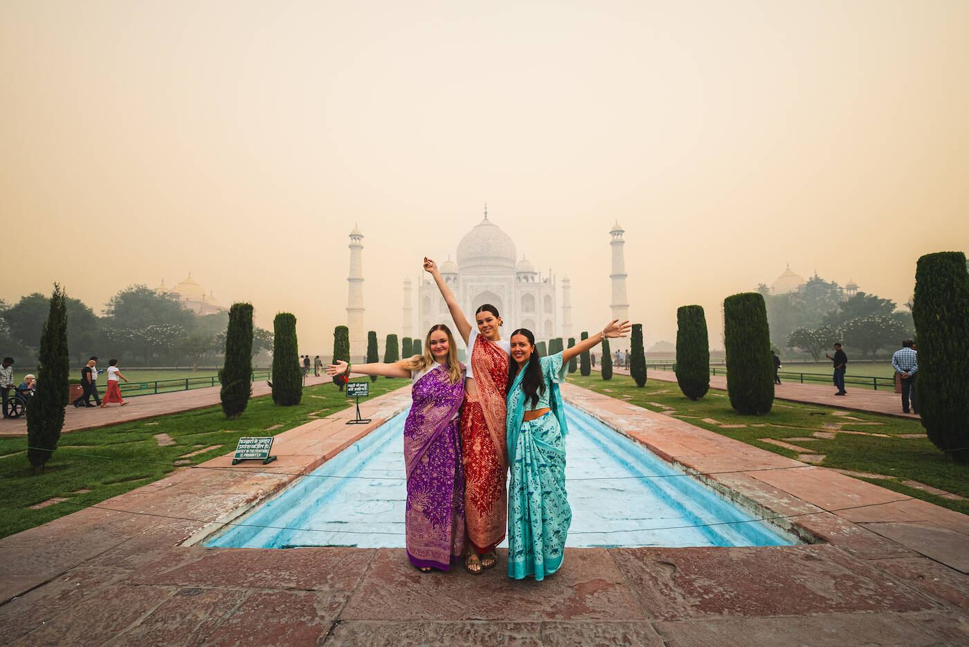 Gänsehaut-Moment: Bei Sonnenaufgang stehen wir vor dem weltberühmten Taj Mahal. Unser Guide zeigt dir versteckte Details & Fotospots. Danach: Frühstück, Rückfahrt nach Delhi und ein letztes Dinner mit der Gruppe – mit Bollywood-Soundtrack! (F)