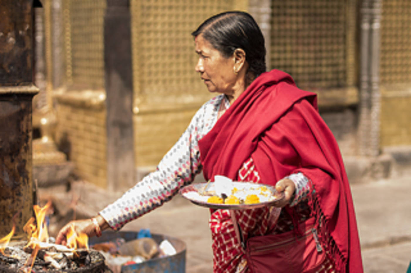 An den Hauswänden sind bunte Handabdrücke aufgedruckt, die Segen und Wohlstand von der Göttin Lakshmi erbitten. Ich durfte in einer Tharu-Familie an einer Ram-Zeremonie teilnehmen. Ich habe mit den Männern der Familie im Kreis um ein Rauchopfer gesessen. Jeder hatte ein großes Bananenstaudenblatt als Teller vor sich. Darauf verschiedene Früchte, Knollen, Süßkartoffeln, Reis und Büffelmilch. Zuerst wurde eine kleine Gabe von allem in das Rauchopfer geworfen. Dann wurden die Früchte verspeist. Es war eine Art Fastenmahlzeit. Manche der Früchte und Knollen hatte ich noch nie gesehen. Es schmeckte aber alles lecker.